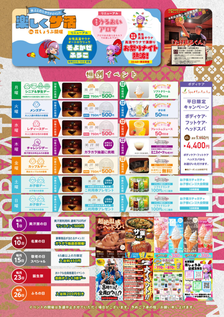 4月の恒例イベントの紹介。毎月のお得情報も掲載していますので、必見です。