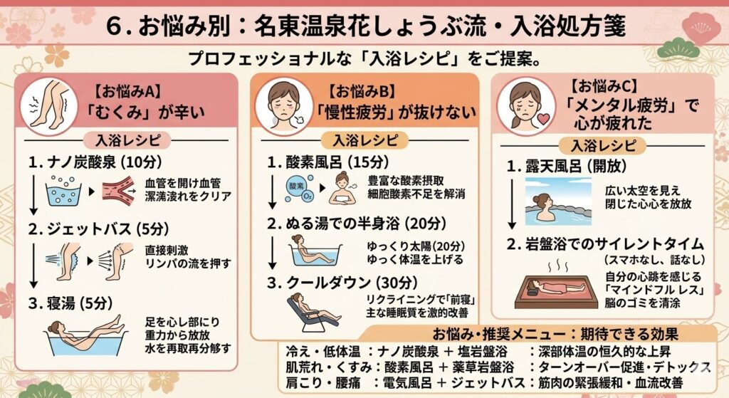 「今日はここが辛い」という具体的な悩みに合わせ、名東温泉花しょうぶの設備をどう組み合わせれば良いか、プロフェッショナルな「入浴レシピ」を提案します。