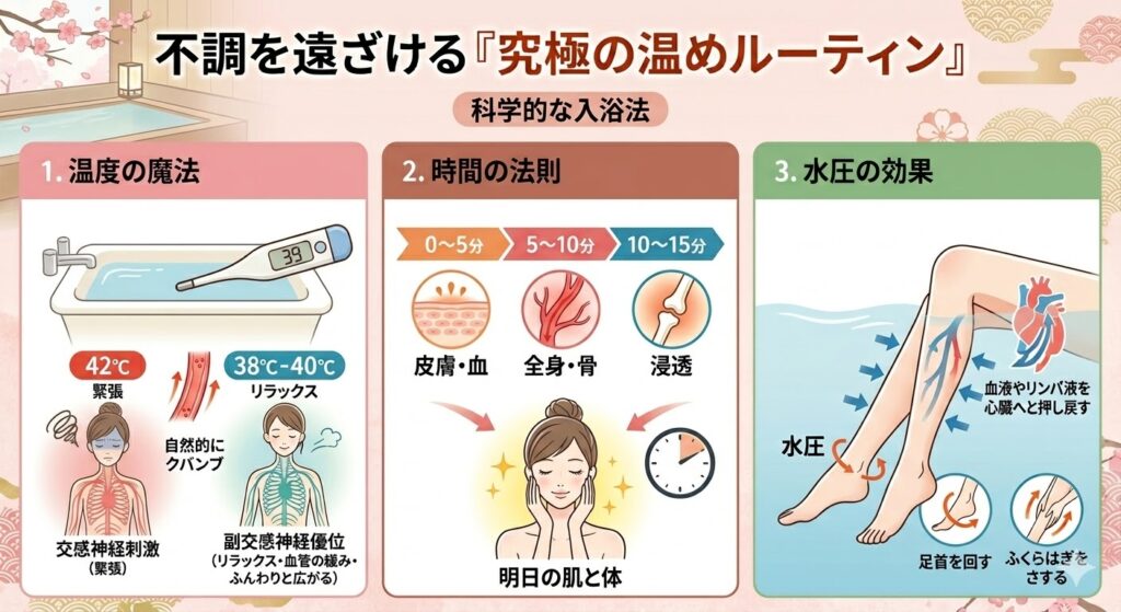 40代以上の女性、あるいは冷えが深刻な方にぜひ守っていただきたいのが、お湯の温度です。 理想は38℃〜40℃、平均して「39℃」のぬる湯です。 42℃以上の熱いお湯は交感神経を刺激し、身体を緊張させてしまいます。反対に、少しぬるいと感じる温度でじっくり浸かることで、副交感神経が優位になり、血管が自然にふんわりと広がります。この「血管の緩み」こそが、深部まで熱を届けるためのゲートなのです。